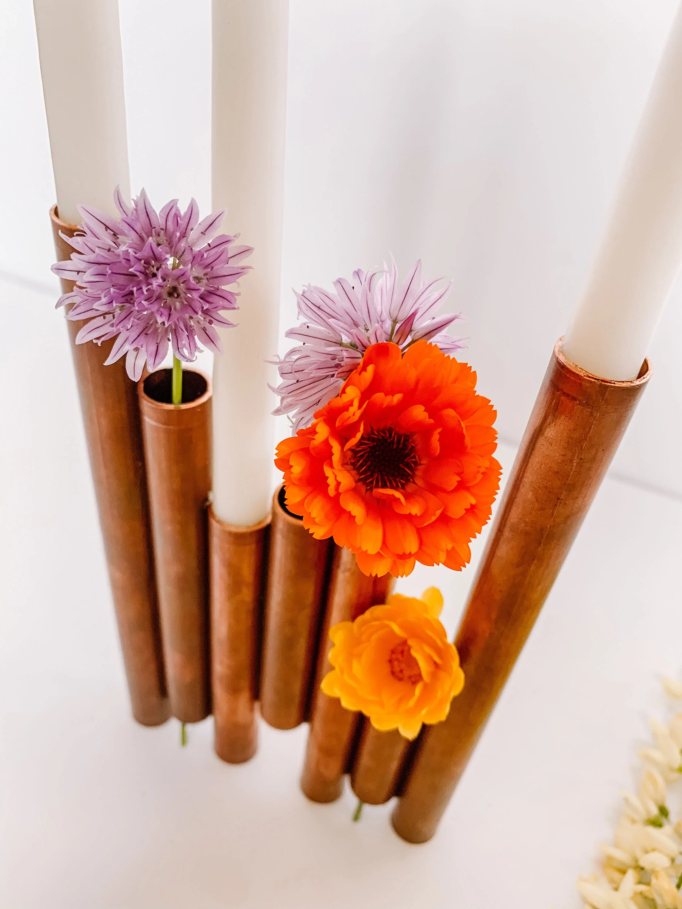 I used a 1/2”” copper pipe for my project but you could definitely go up to a larger size if your candles are wider. The average candle is 1/2” to 1” wide. I suggest getting a candle that is slightly larger than your pipe. Then you can taper the ends so it fits snugly inside.